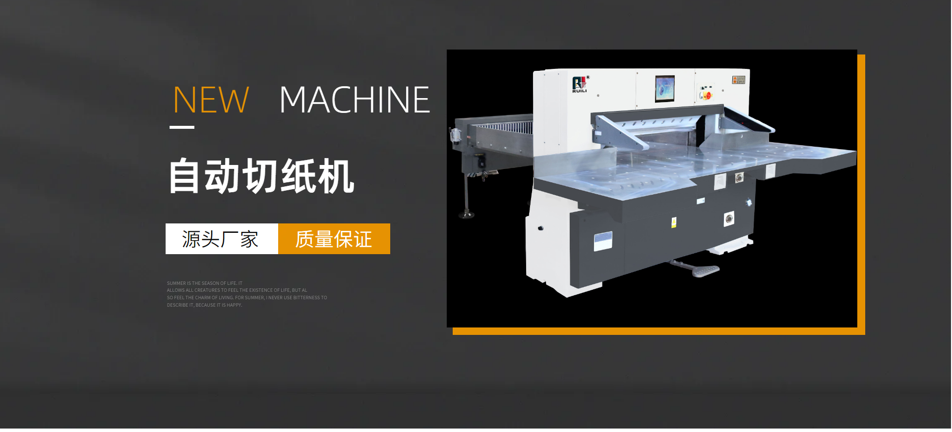 瑞安市瑞勝機械有限公司是一家專業(yè)集“生產(chǎn)、銷售、服務(wù)”于一體的印刷包裝機械企業(yè);有二十余年專業(yè)制造切紙機的經(jīng)驗,在切紙機行業(yè)中享有較高聲譽。研制出集光、機電、液為一體的高性能高品質(zhì)的切紙機系列產(chǎn)品,主要產(chǎn)品有電腦切紙機,雙液壓電腦切紙機,雙導(dǎo)軌數(shù)顯切紙機,快捷式壓痕機系列,覆膜機、上光機、燙金機等系列產(chǎn)品。